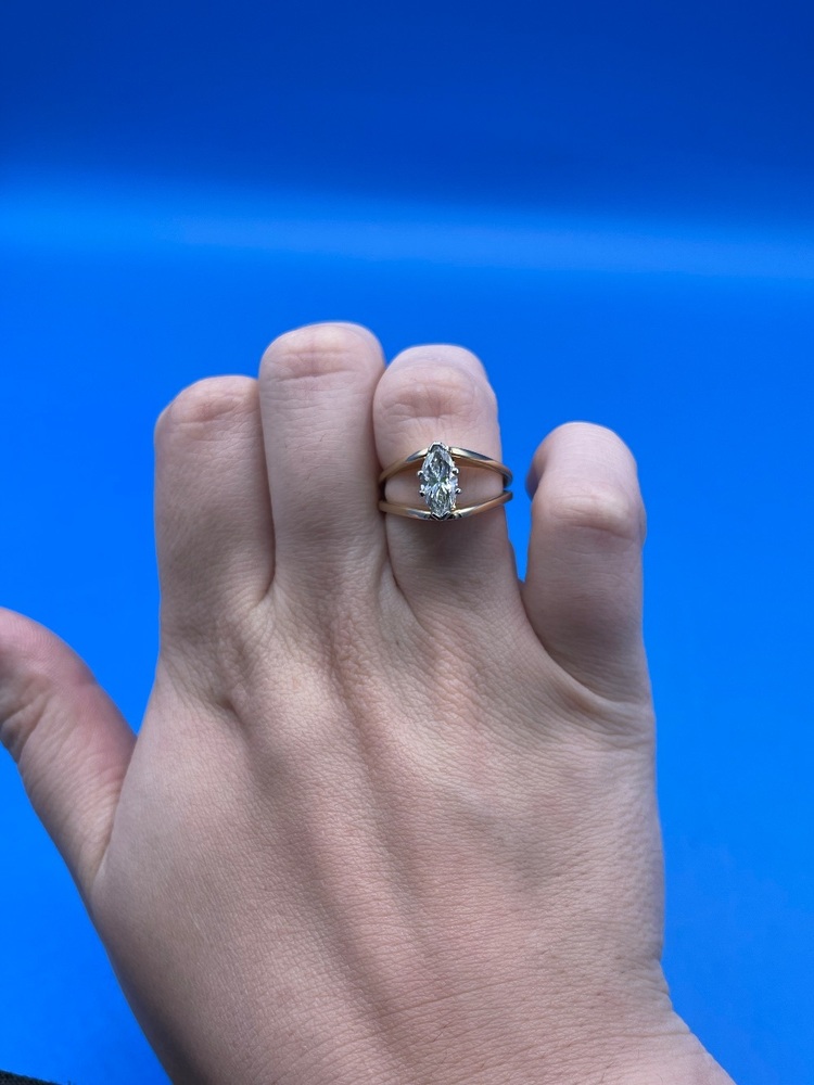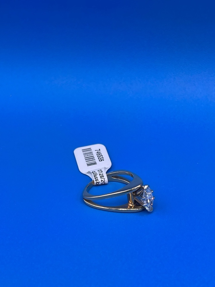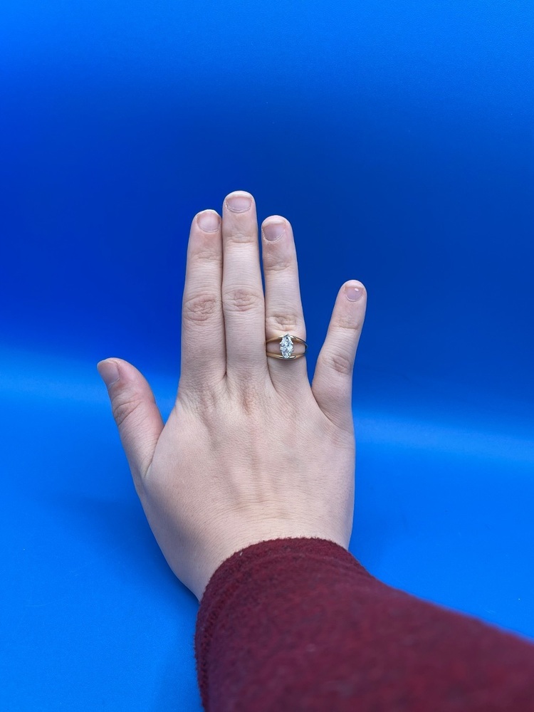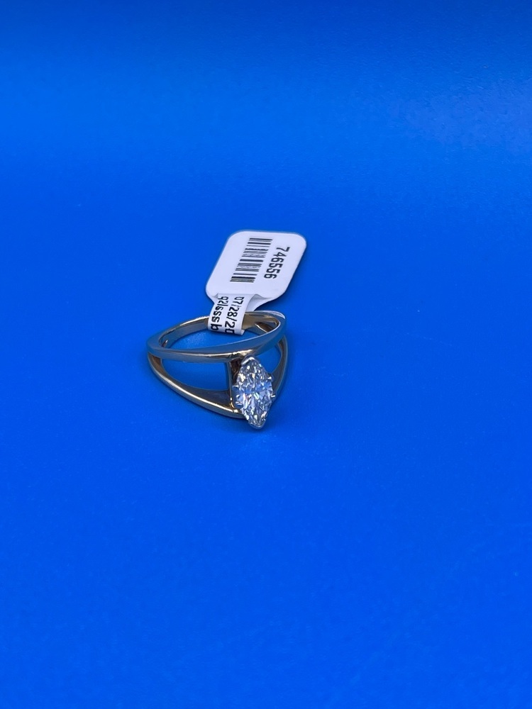 The Golden Navette is a spectacular "boat shaped" Marquis Cut ring. This beautiful ring is 14 kt Yellow Gold and a ring size 6. It is a big ring with a high setting making it a classy eye-catcher. (We also offer Ring Resizing seperately)