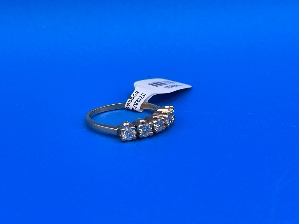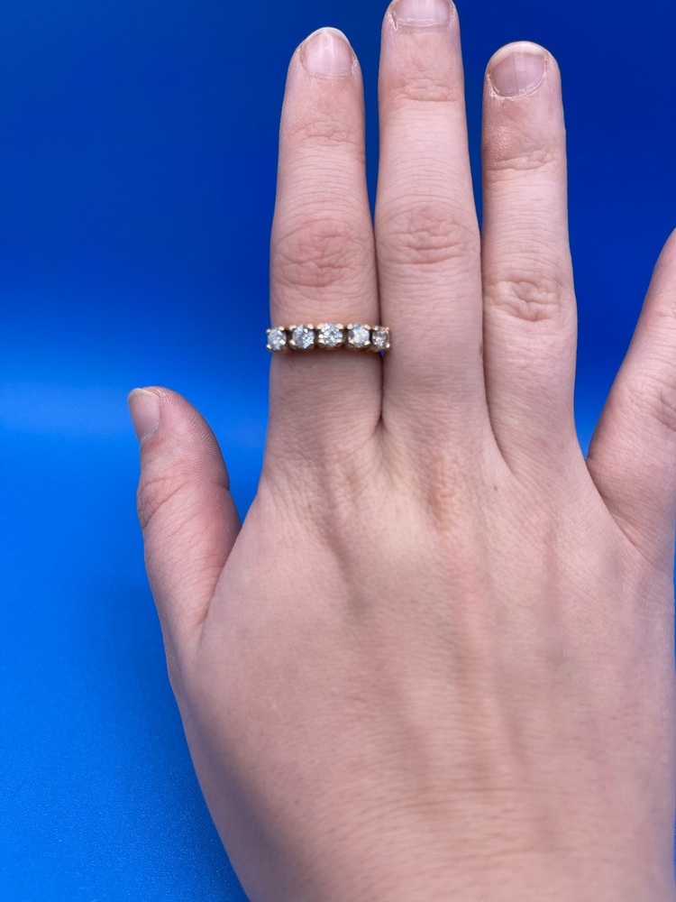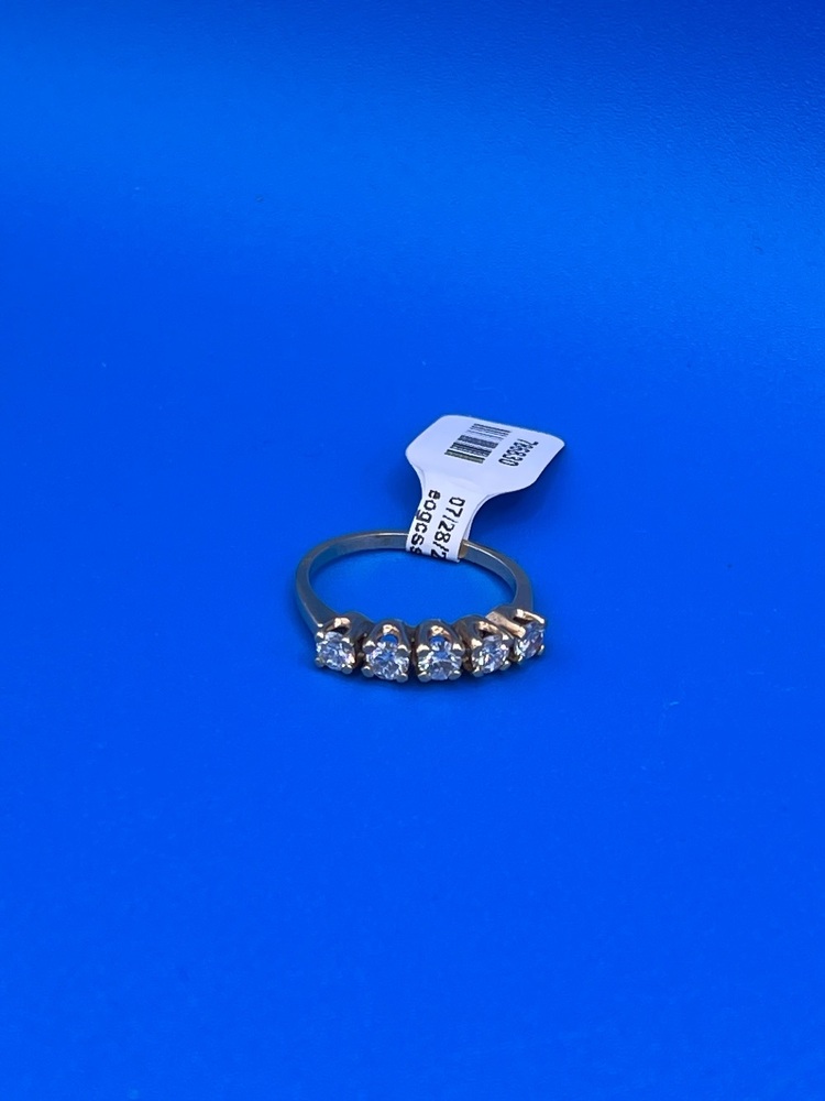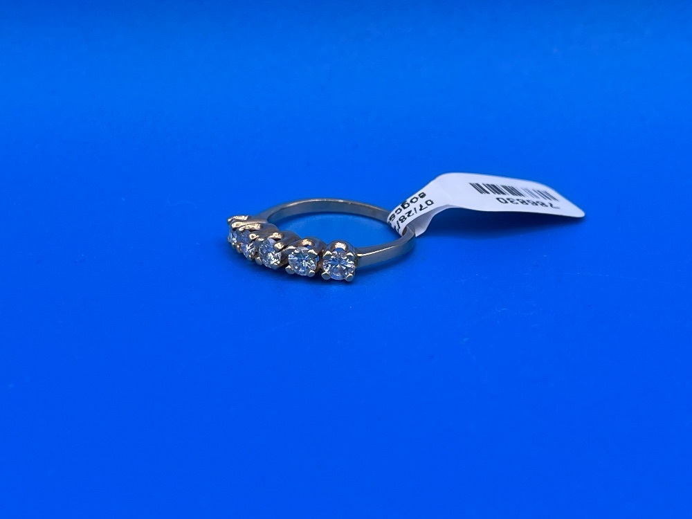 LAST CHANCE: The Radiant Row is a stunning ring with 5 gorgeous round stones on a Yellow Gold 14kt band. It is a size 7 1/2 but resizing is available seperately. This ring would be the perfect stacking piece or would make a statement all on its own. Don't miss out!